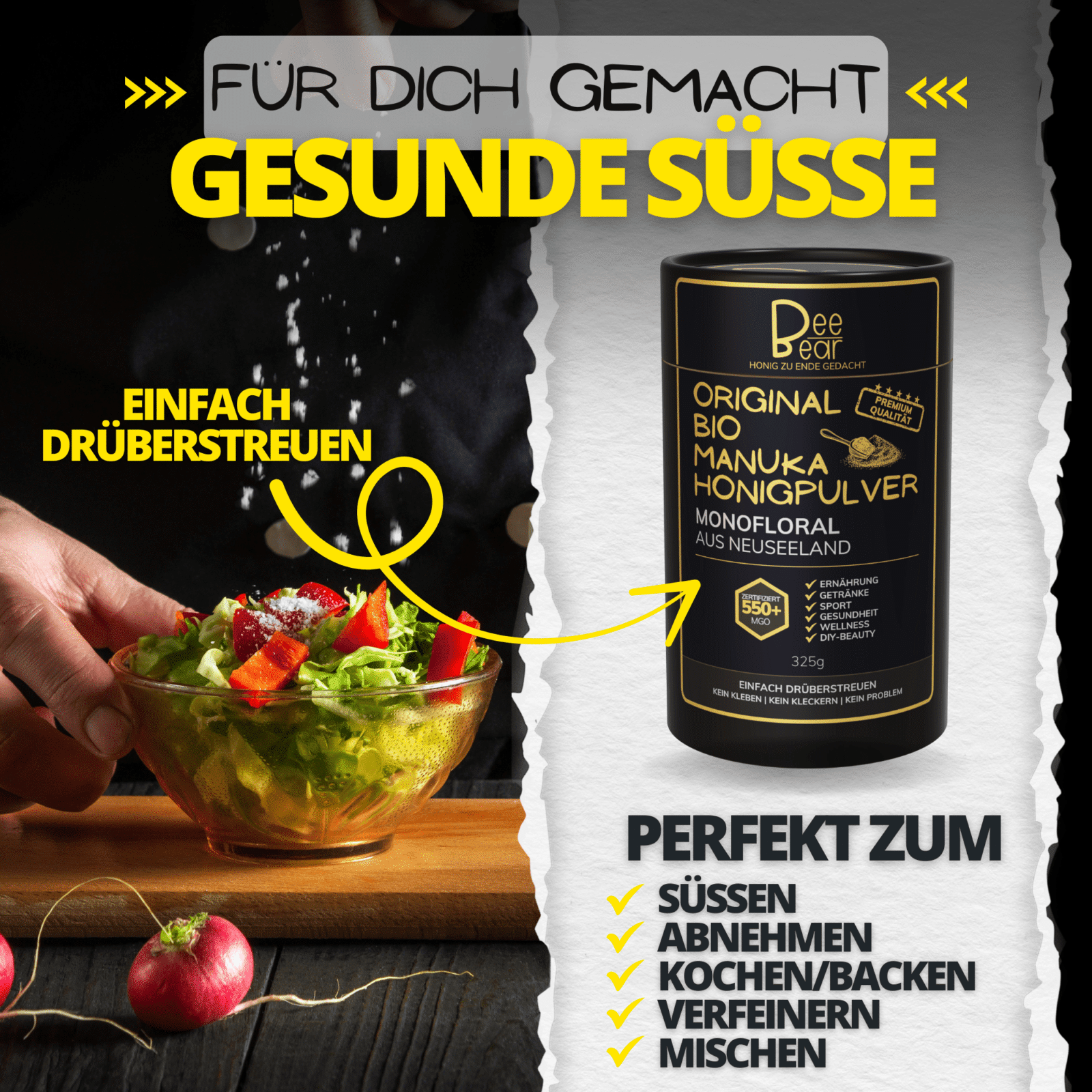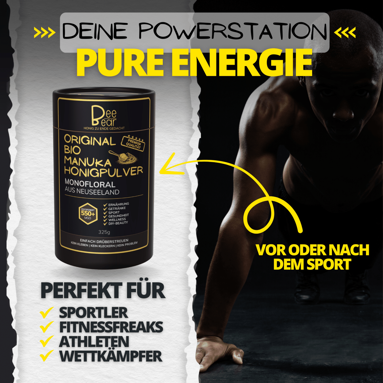 Was du hier siehst, ist kein gewöhnliches Produkt – es ist der Manuka-Moment, neu gedacht. BeeBear Bio Manuka Honigpulver bringt dir die pure Kraft neuseeländischer Manuka-Blüten – in einer Form, wie du sie noch nie erlebt hast: als Pulver. 100 % Natur, 0 % Kleckerei. Praktischer, alltagstauglicher & benutzerfreundlicher als alles Andere.